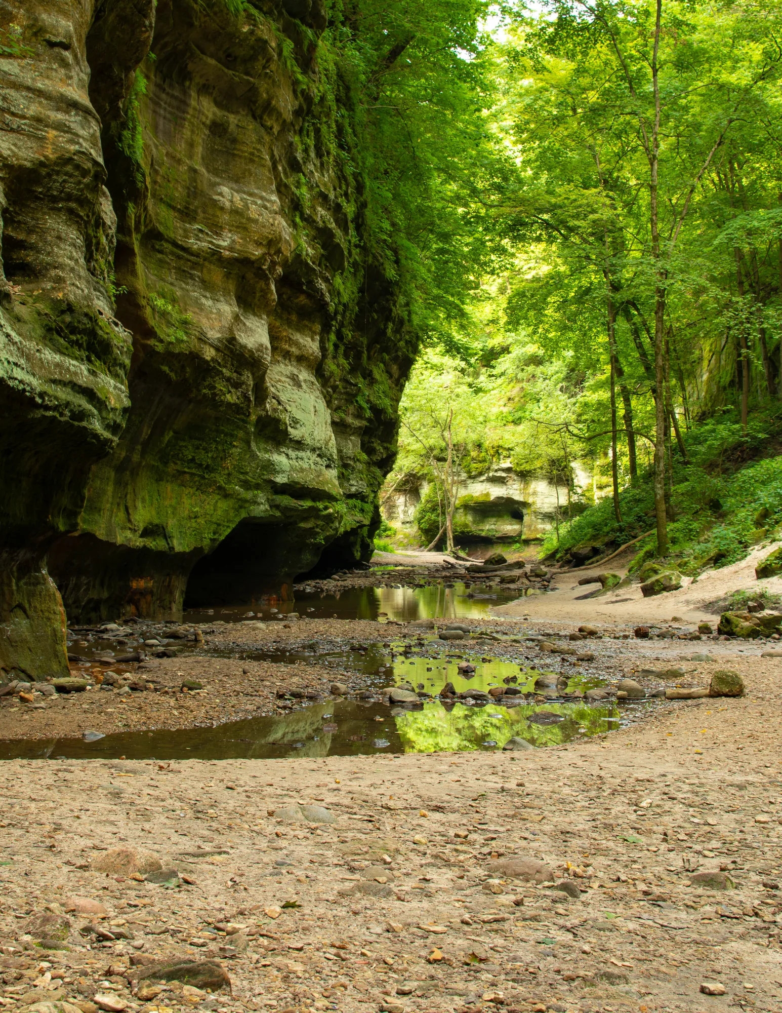 At Starved Rock and Matthiessen, movement naturally softens. Trails curve instead of compete. Canyons reveal themselves gradually, as though asking you to pay attention rather than conquer them. You begin to notice the sound of your steps, the way the air cools inside stone corridors, the gentle shift of light across canyon walls.